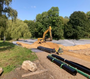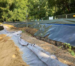 Sobald der Großteil der Kunststoffdichtungsbahnen verlegt und verschweißt wurde und die Sohle des Weihers somit fertiggestellt ist, wird dieser tiefere Abschnitt vorab mit Wasser gefüllt. Dadurch wird ein Ersatz für das derzeitige Amphibienersatzgewässer geschaffen. Das Ersatzgewässer muss zurückgebaut werden, da der Uferbereich des Weihers in diesem Abschnitt noch profiliert und mit den Kunststoffdichtungsbahnen eingedichtet werden muss. Diese Maßnahmen werden voraussichtlich im Oktober umgesetzt.