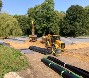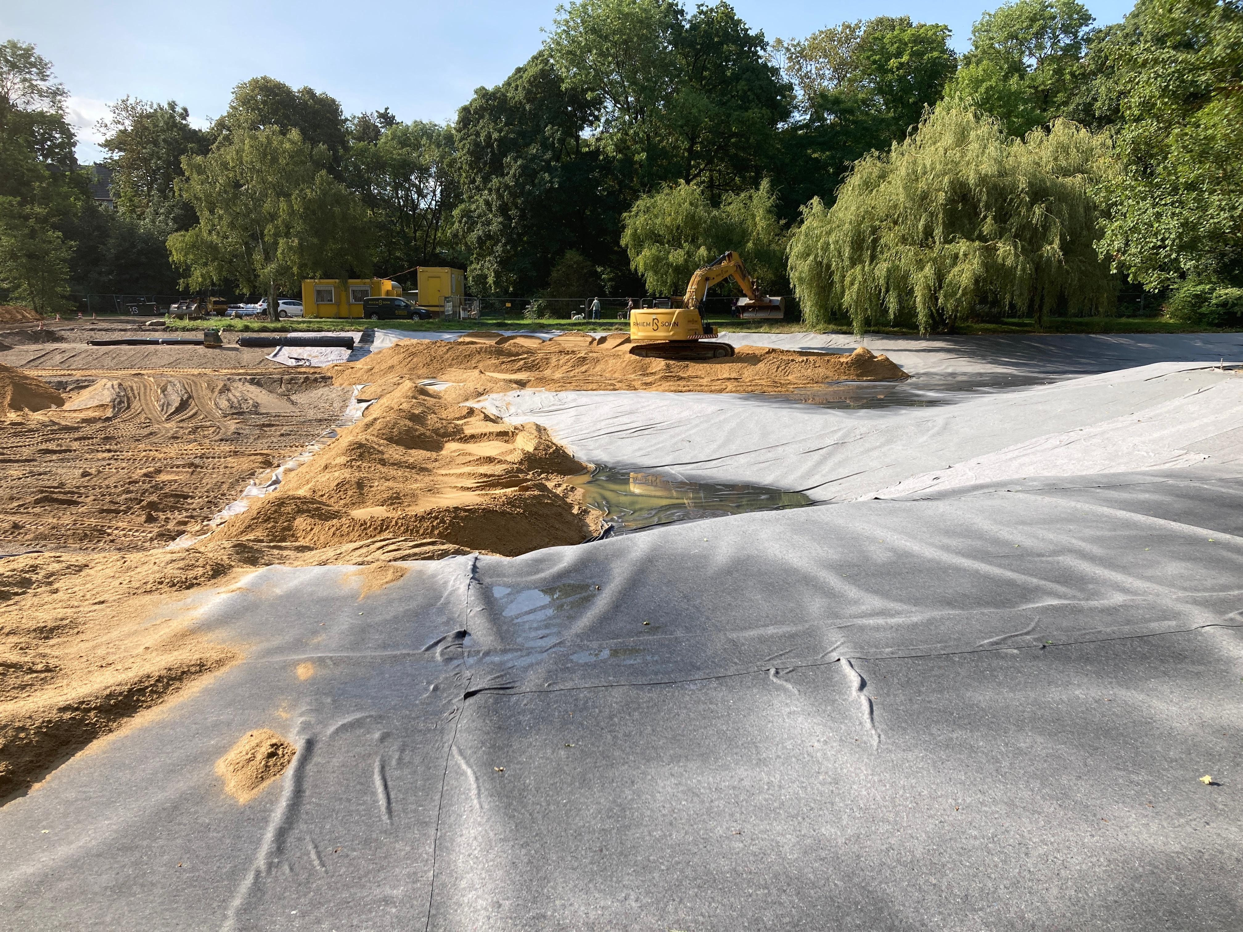 Nachdem im Sommer 2025 die Auskofferung am Klettenbergparkweiher durchgeführt und eine ebene Oberfläche erstellt wurde, begann Anfang September die Verlegung der Kunststoffdichtungsbahnen (KDB) als Sohlabdichtung des Weihers.