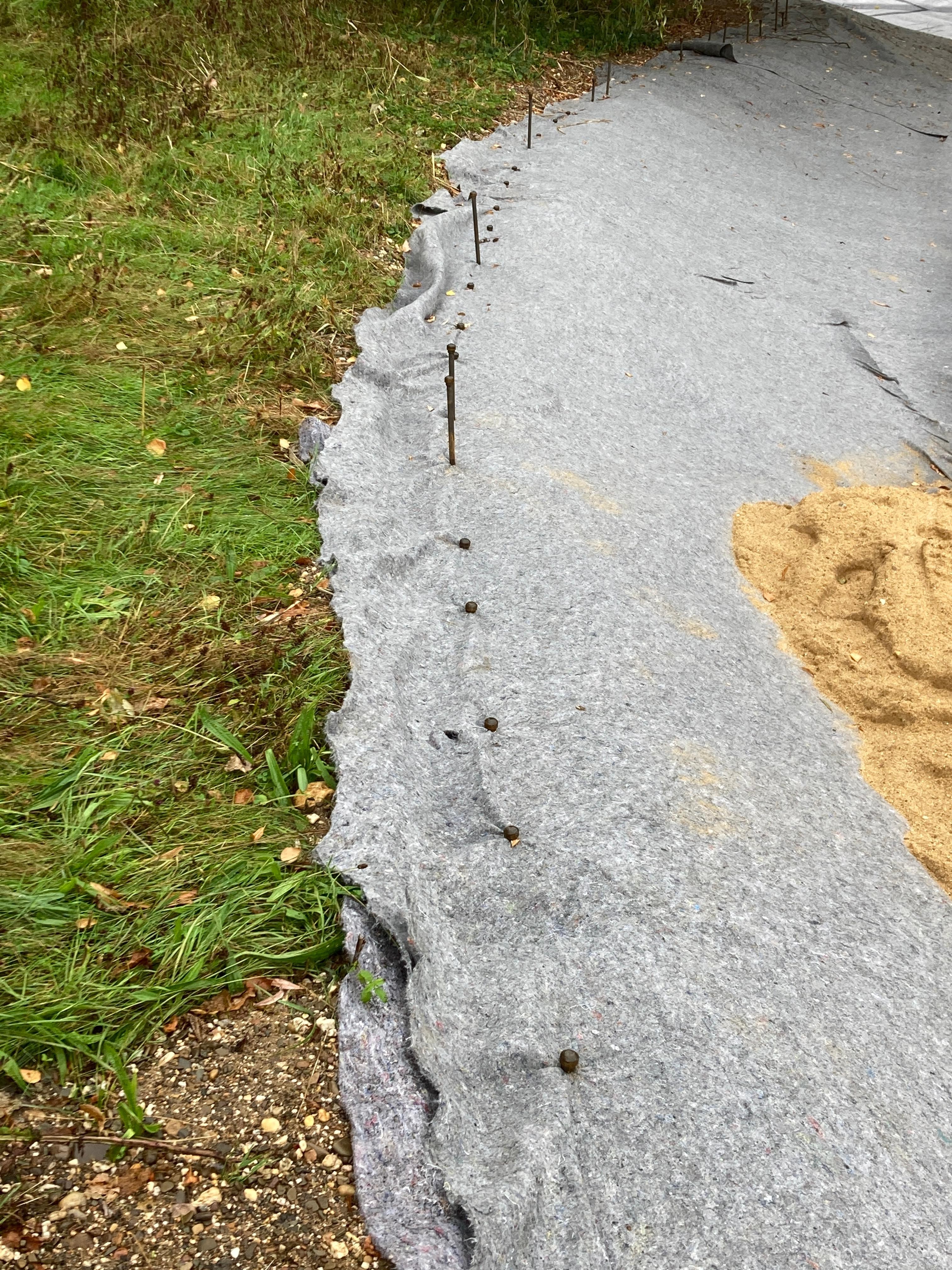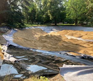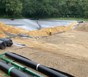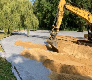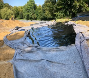 Die neue Weihersohle wird aus verschweißten Kunststoffdichtungsbahnen gefertigt, die besonders langlebig und unempfindlich gegen Durchwurzelung und mechanische Beschädigung sind. Darüber wird eine ca. 20 cm dicke Sandschicht aufgebracht, die zusätzlichen Schutz bietet.
