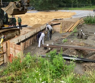 Die Dichtigkeit wird dadurch erreicht, dass die einzelnen Bahnen miteinander verschweißt werden. Die Kunststoffdichtungsbahnen werden bis ans künftige Ufer verlegt und mit langen Erdnägeln befestigt. Parallel dazu haben die Betonarbeiten im Bereich der ehemaligen Plattform und des Zulaufs begonnen, darunter die Schalung und Bewehrung. Dabei werden Kunststoffprofile eingebaut, an die die Kunststoffdichtungsbahnen dicht angeschlossen werden können. Die Plattform wird wieder in ihrer historischen Form errichtet.