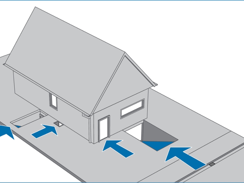 Im Hochwasserfall gibt es mehrere Wege, wie Wasser in Ihre Immobilie eindringen kann. Zunächst kann Oberflächenwasser über Lichtschächte, Kellerfenster oder ebenerdige Türen ins Gebäude gelangen – besonders dann, wenn diese Öffnungen unterhalb des umgebenen Geländeniveaus liegen. Steigt der Wasserstand weiter, kann Wasser durch Türen, Fenster oder auch durch durchfeuchtete Wände ins Innere eindringen.