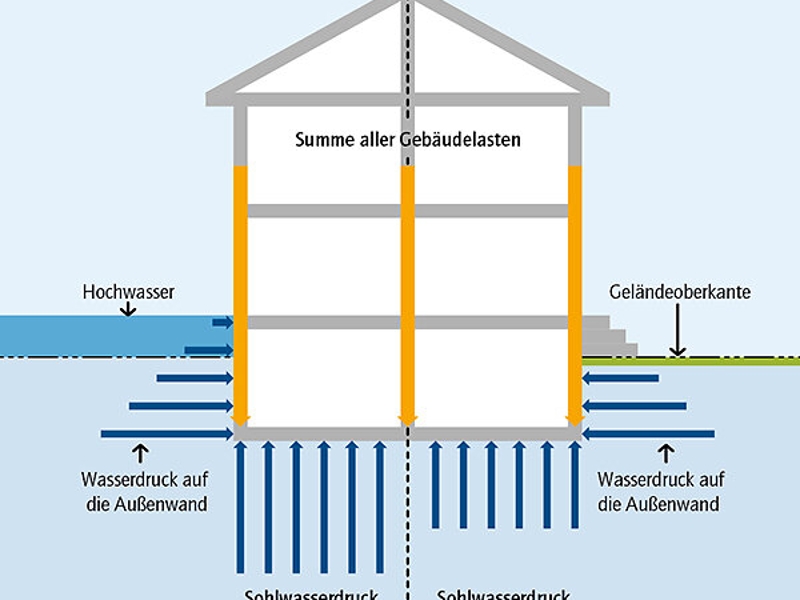 Sobald der Grundhochwasserstand über das Niveau des Kellerbodens steigt, entsteht Wasserdruck. Das belastet die Bausubstanz von unten und von der Seite. Besonders kritisch sind die Auftriebskräfte, die auf die Bodenplatte wirken: Ist der Druck zu stark, kann der Kellerboden reißen – oder das gesamte Gebäude an Standfestigkeit verlieren („aufschwimmen“).
