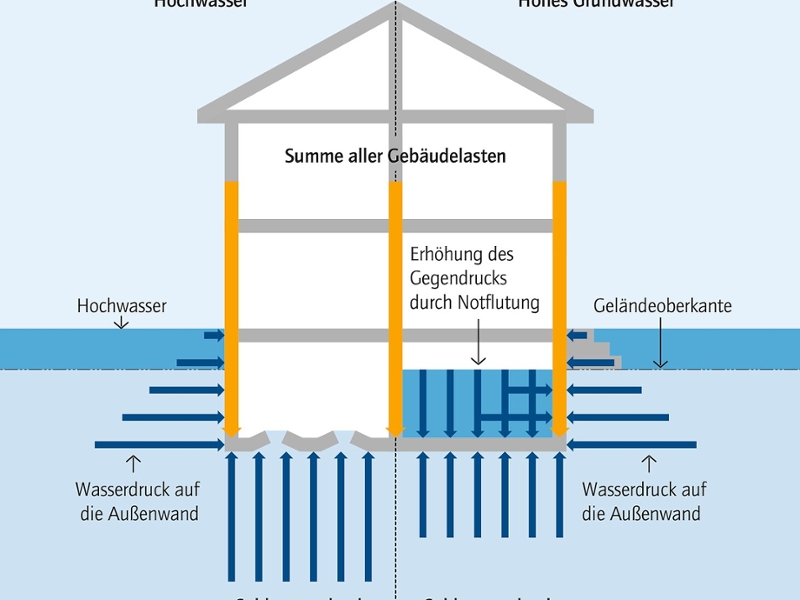 Auch fernab vom Fluss kann Hochwasser Gebäude bedrohen. Grundhochwasser entsteht meist zeitverzögert nach einem Hochwasser: Selbst wenn der Wasserstand im Fluss sinkt, kann das Grundwasser noch weiter steigen. Hat das Grundhochwasser das Niveau des Kellerbodens überschritten, dann entstehen Wasserdruck und Auftriebskräfte an Gebäuden, die erhebliche Schäden an Bauwerken verursachen können. Wie es entsteht, worin die Risiken liegen und welche Schutzmöglichkeiten es gibt, erfahren Sie hier.