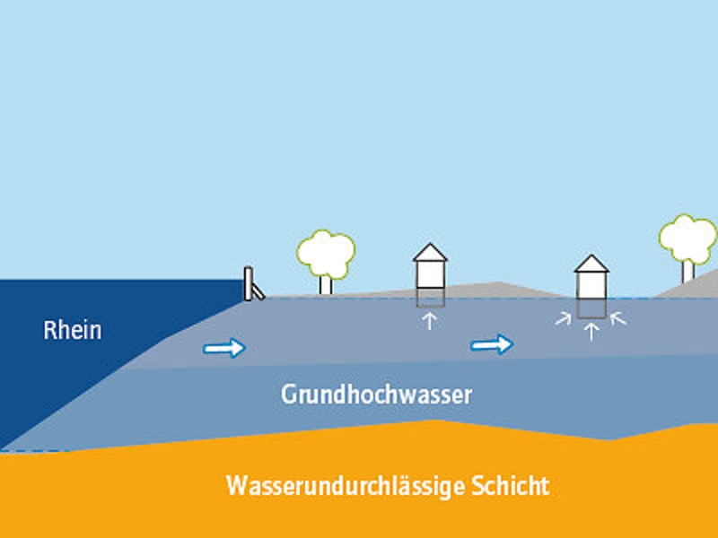 Gerade in Gebieten, die weiter entfernt vom Fluss sind, wird die Gefahr von Grundhochwasser für die Gebäude oft unterschätzt. Nicht zuletzt auch, weil die Grundwasserstände oft erst Tage oder Wochen nach dem eigentlichen Hochwasser im Fluss ansteigen und selbst dann noch zunehmen können, wenn der Rheinwasserstand längst wieder fällt.