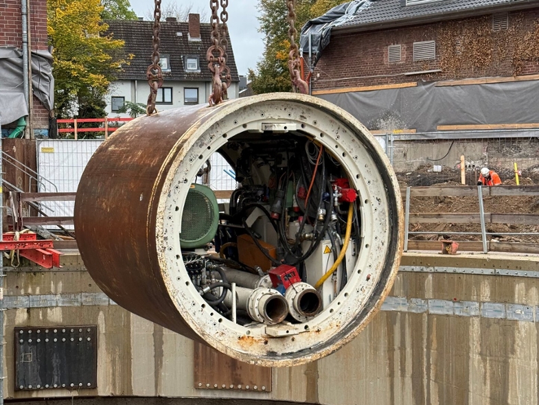 Nach dem Abpumpen der zuvor gefluteten Baugrube wurde die insgesamt 92 Tonnen schwere Maschine in drei Teilen mithilfe eines Schwerlastkrans aus dem Schacht gehoben. Der Vortrieb erfolgte im Schichtbetrieb rund um die Uhr und wurde innerhalb von sechs Wochen abgeschlossen.