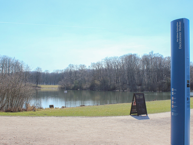In dieser Woche wurden fünf neue Informationsstelen aufgestellt: zwei am Decksteiner Weiher, zwei am Kalscheurer Weiher und eine am Volksgartenweiher. Parkbesucher*innen können auf diesen Stelen viel über die Geschichte, die Gartenarchitektur sowie die Flora und Fauna der Parkweiher und der umgebenden Parkanlagen erfahren. Ergänzt werden die Informationen auf den blauen Landmarken durch ein digitales Info- und Unterhaltungsangebot in der Web-App, das über einen QR-Code auf der Stele mit dem Smartphone abgerufen werden kann. Geschichten und Bilderstrecken, Hörbeiträge (gesprochen von Christoph Biemann) und geführte Parkspaziergänge gibt es auch zu anderen Parkweihern auf der Website www.parkweiher.koeln .