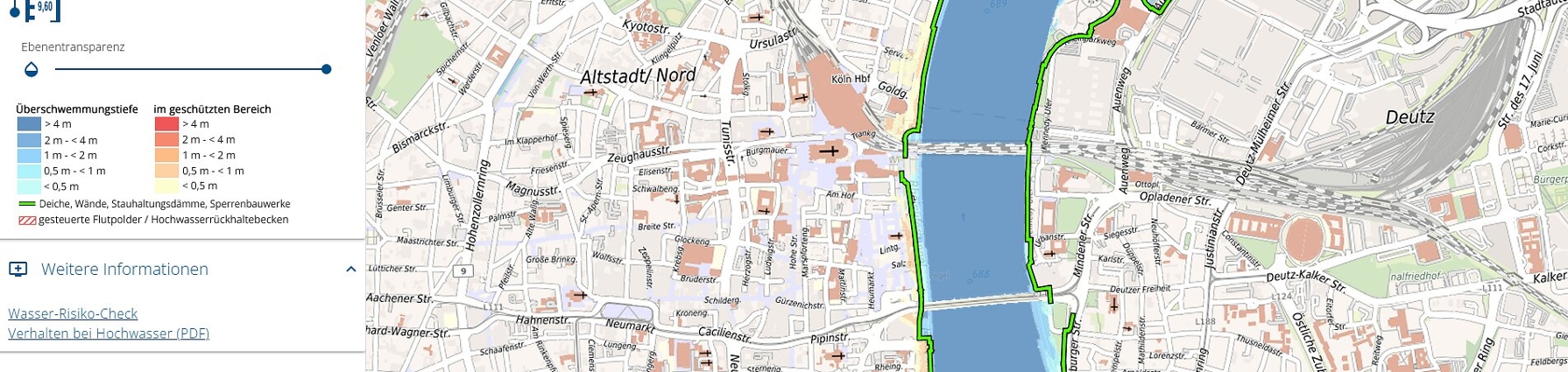 Hochwassergefahrenkarten zeigen, welche Flächen bei Hochwasser am Rhein, Strunde, Frankenforstbach und Mutzbach überflutet werden können, welche Wassertiefen zu erwarten sind und wo Hochwasserschutzanlagen stehen. Für den Rhein sind vier und für die Bäche drei verschiedene Häufigkeits-Szenarien verfügbar.