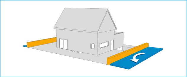Das Ziel bei der Abschirmung des Gebäudes ist es, das bei Starkregen zufließende Wasser von dem Gebäude und Öffnungen fernzuhalten. Dies kann bei Neuplanungen bereits durch eine entsprechende Standortwahl und eine angepasste Geländegestaltung erreicht werden. Im Bestand sind die Möglichkeiten oft nicht gegeben. Hier kann der Wassereintritt mit Hilfe von Bodenschwellen, Mauern oder Aufkantungen vermieden werden.