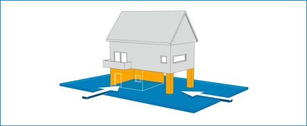 Bei der nassen Vorsorge geht es nicht darum, das Wasser vom Gebäude fernzuhalten, sondern um die Begrenzung von Überflutungsschäden. Es bestehen grundsätzlich zwei Möglichkeiten der nassen Vorsorge: die gezielte Flutung oder die Aufständerung des Gebäudes.
